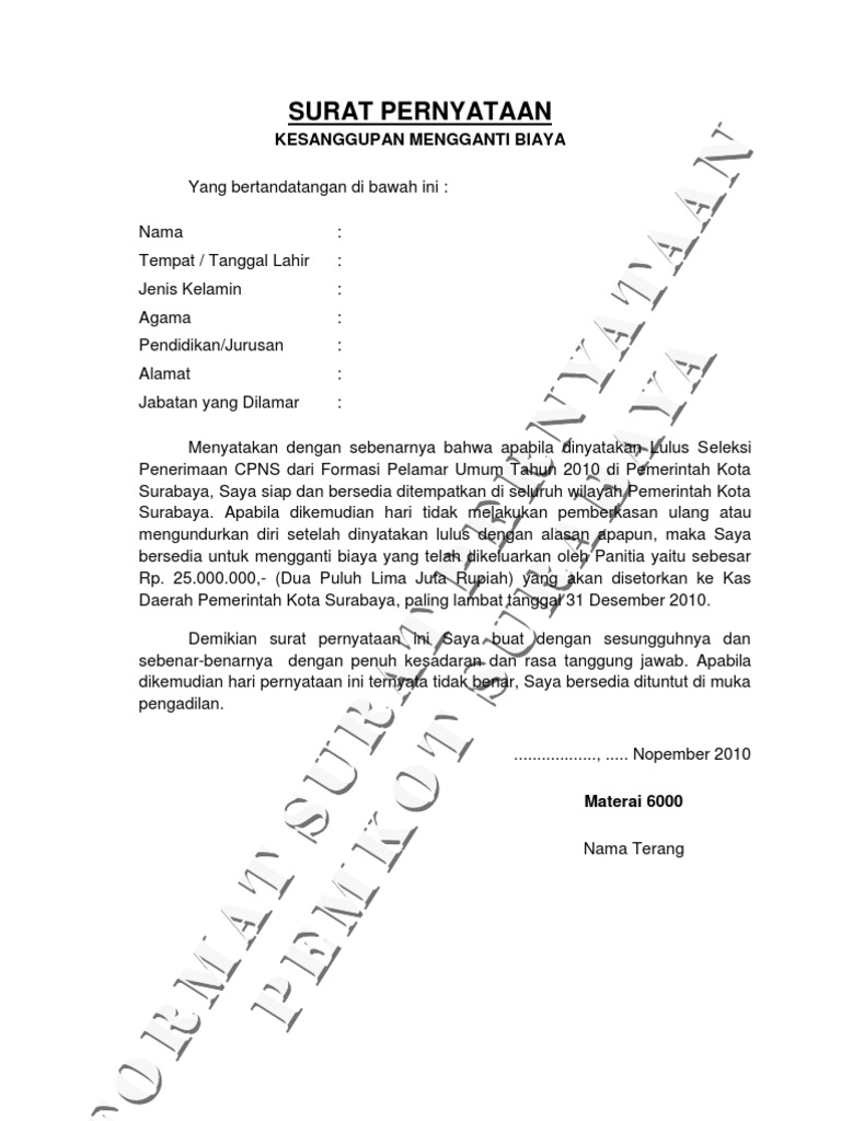 for "Contoh Surat Pernyataan Bersedia Mengganti Biaya Seleksi Apabila Mengundurkan Diri / Meterai"